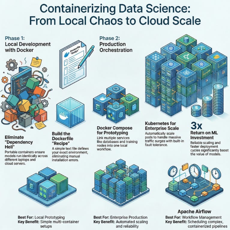 Today, we’re zooming in on Containerization for Data Science, with a special spotlight on Docker Implementation and Orchestration. If you’ve ever battled the nightmare of “it works on my machine” dependencies those frustrating hours lost to mismatched Python versions or vanishing GPU drivers you’re in for a treat. This is the stuff that turns chaos into smooth, scalable workflows, letting your ML experiments thrive anywhere from a local laptop to a cloud cluster. let’s dive in.