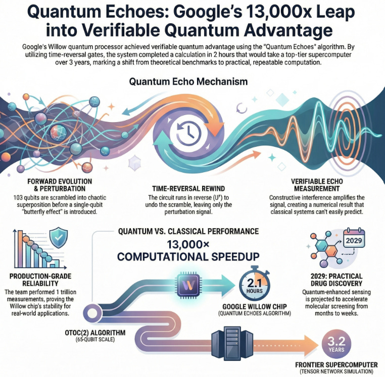 What happened: Google Quantum AI published a breakthrough demonstrating the first-ever verifiable quantum advantage using its Willow quantum processor and the Quantum Echoes algorithm (OTOC). The algorithm completed calculations in 2.1 hours that would require an estimated 3.2 years on Frontier, the world’s fastest supercomputer achieving a 13,000× speedup while maintaining repeatability across quantum systems.